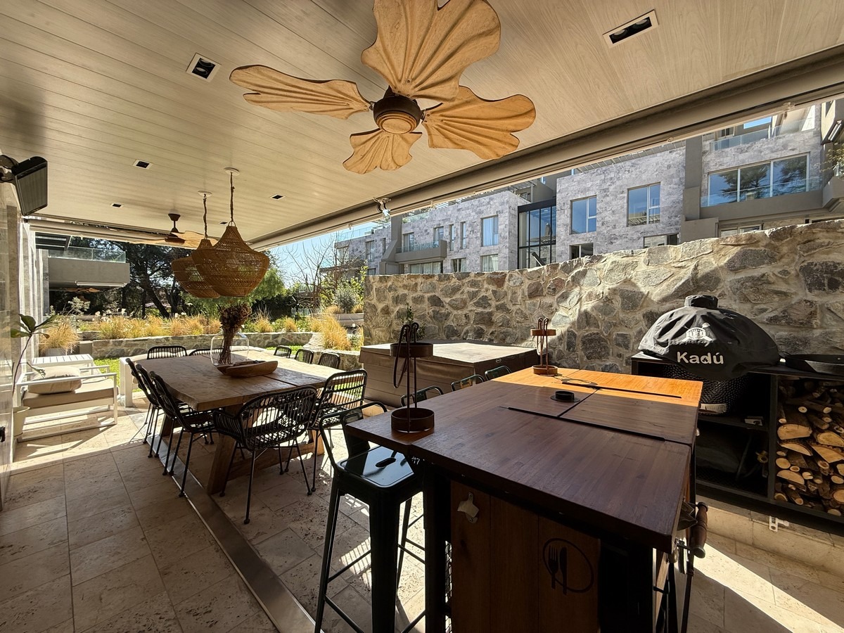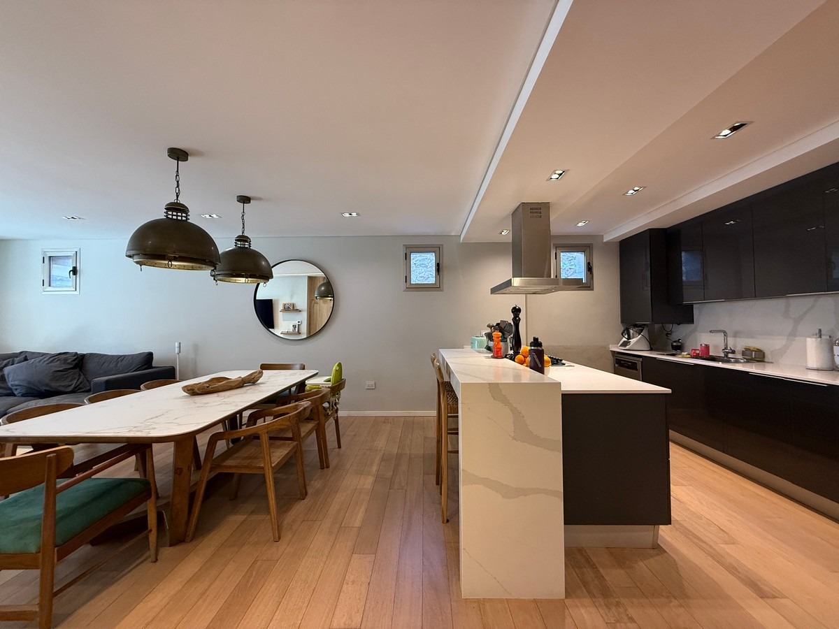 • Cocina equipada con mueble bajo mesada, alacena, anafe Ariston, campana, bacha de acero inoxidable Johnson, horno marca Cata, mesada de Silestone y barra de Neolith.